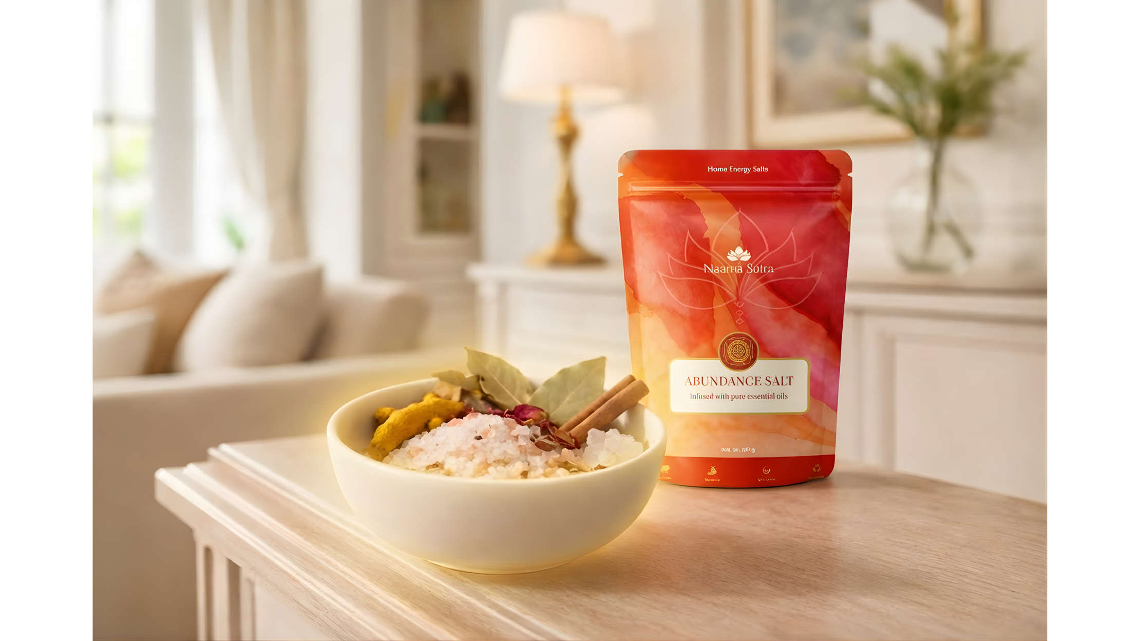 Place the salt in an open bowl or container made of glass or ceramic. Keep it uncovered so it can interact gently with the air and scent of the space. Avoid metal containers, as salt can react with metal over time and cause corrosion.
